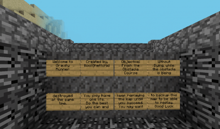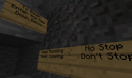Карта довольно не обычная, так как в стиле паркур от вас часто требуется продумывать всё что вы делаете и тратить на это время, здесь у вас такого вы не встретите. Эту карту для MCPE надо проходить, как говорится на одном дыхании, без остановок и долгих раздумий иначе вы обречены на провал.