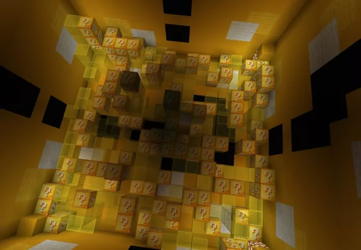 Карта LuckyLand для Minecraft — это захватывающее приключение, полное лаки блоков, парящих в воздухе и наполненных удивительными сокровищами и случайными событиями. это необычная карта, где выживание полностью зависит от удачи.