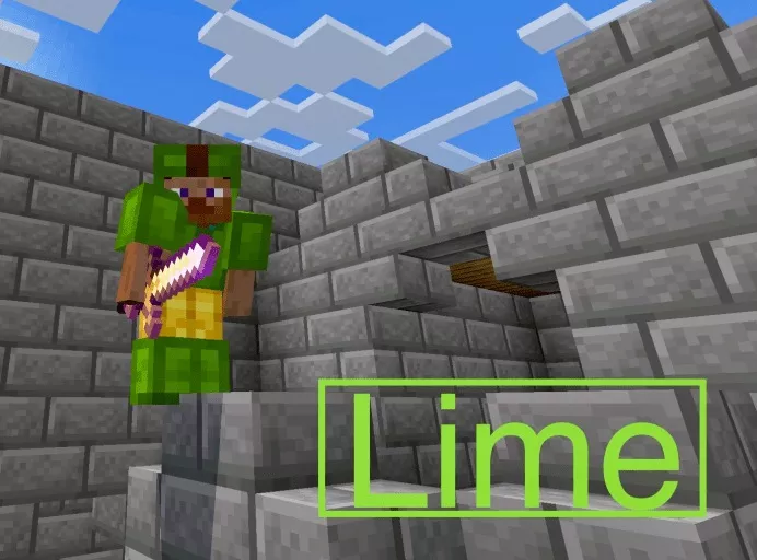 - Лаймовый: Кожаная броня, золотой меч с аспектом огня, мощный лук, эффекты скорости и прыжка.