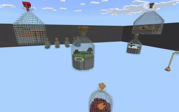 Погрузитесь в миниатюрную вселенную с картой World in a Jar для Minecraft Bedrock Edition — выживание, полностью происходящее внутри гигантских стеклянных банок. Каждая банка содержит уникальный биом или структуру, висящую в пустоте и наполненную ценными ресурсами, тайниками и атмосферными испытаниями.