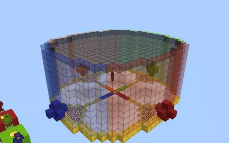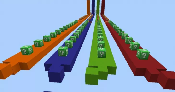 Карта Lucky Block Race Pro превращает обычный паркур в азартное состязание, где удача играет не меньшую роль, чем навыки прыжков. Четыре цветные дорожки тянутся параллельно друг другу, создавая арену для захватывающих гонок между игроками.,
