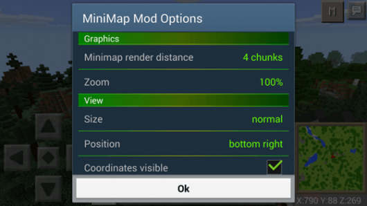 Если вам не хватало миникарты в игре Minecraft PE PE 0.15.6 тогда мод Smooth Minimap позволит добавить её. У миникарты есть огромное количество настроек, благодаря которым вы можете максимально комфортно подстроить её под себя. Карта будет отображать всё, что ждет вас впереди и даже будет показывать кокой биом будут дальше. Теперь вы всегда будете знать где находятся границы биомов в Майнкрафт ПЕ и точно знать, какой ландшафт ждет вас впереди. Что бы перейти к настройкам карты, просто удерживайте палец на самой миникарте, после чего появится меню, в котором вам будет доступен ряд функций, которые улучшат внешний вид и детализацию.