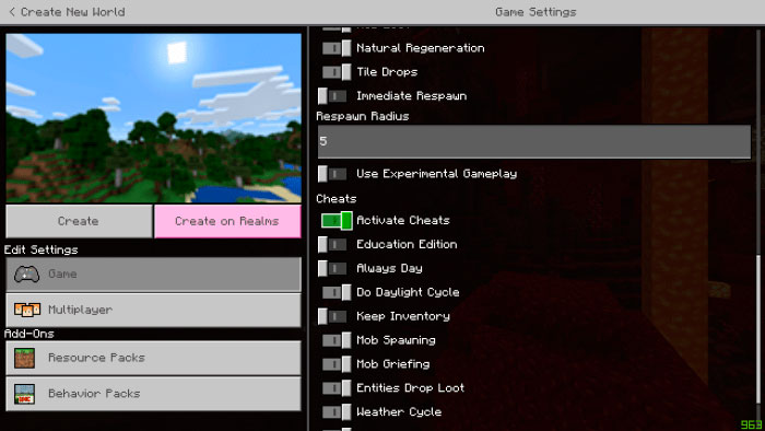 1. Игроку, который установил мод необходимо создать новый мир. В процессе создания нужно включить читы.