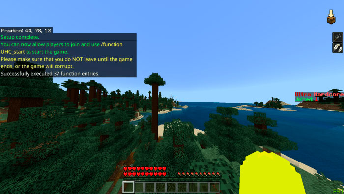 6. Ввод команды «/function UHC_start» активирует игру и телепортирует игроков в случайное место.
