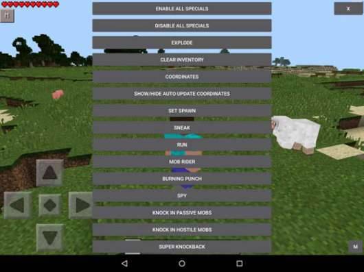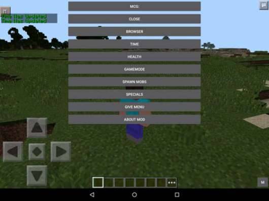 После того, как вы зайдете в меню мода, а для этого нажмите на кнопку `MCG` в правом нижнем углу экрана. Перед вами будет основное меню модификации где вам будет предложено изменить время, восстановить здоровье, вызвать мобов и многое другое. Так же вам будет доступно такие возможности, как взрыв, езда на мобах и многое другое.