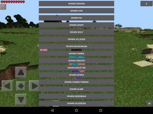 Зайдя в меню призыва мобов в MCPE вы увидите полный список всех мобов, которых вы можете призвать. После нажатия на соответствующий пункт с названием моба, рядом с вами появится выбранный моб.