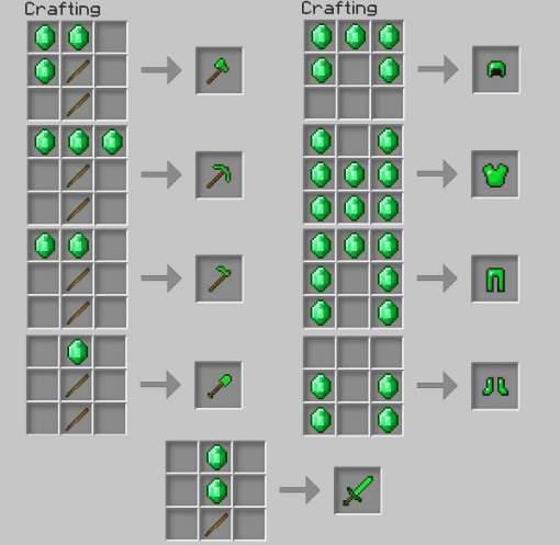 После того, как у вас будет достаточное количество материалов, можете приступать к процессу крафта, все рецепты доступные вам будут изображены на картинке ниже. Процесс крафта новых вещей в моде EmeraldCraft для Pocket Edition ничем не отличается от стандартного, поэтому вы быстро во всем разберетесь.