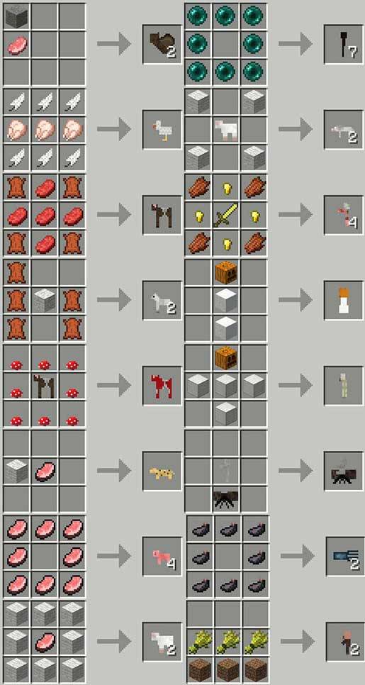 Рецепты крафта довольно простые и очень понятные, всего вам будет доступно для крафта 37 различных мобов, животных и предметов. Создавать вы их будите из необходимых материалов на верстаке, после чего они будут добавляться вам в инвентарь в качестве предметов.