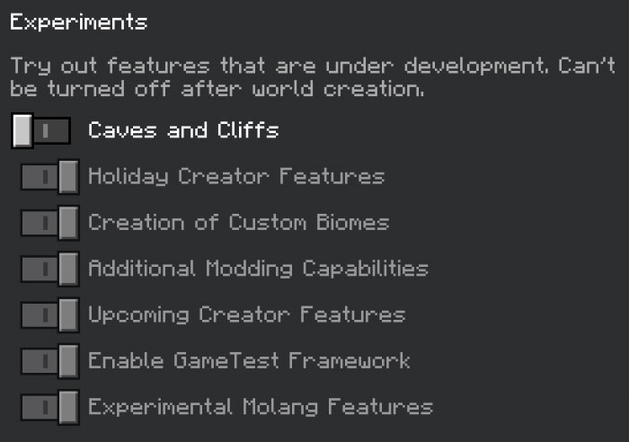 ВАЖНО!!! Для работы мода включите все функции экспериментального режима игры в настройках мира, как это показано на картинке ниже.