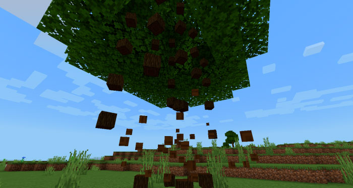 Данная модификация позволит вам сломав один блок древесины обрушить всю его нижнюю часть, таким образом вы получите все блоки дерева, а листва и ветки будут висеть в воздухе. Этот мод для Minecraft на Android работает со всеми типами древесины включая деревья нижнего мира.