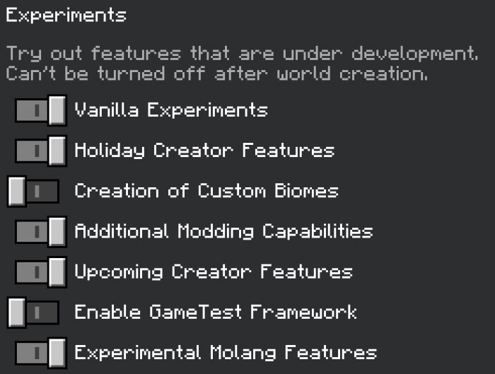ВАЖНО!!! Для работы мода включите некоторые функции экспериментального режима игры, как это показано на картинке ниже!!!