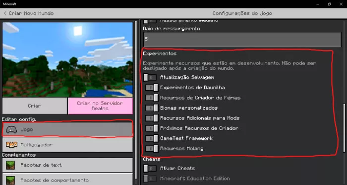 ВАЖНО!!! Для работы мода включите все функции экспериментального режима игры в настройках мира, как это показано на картинке ниже!!!