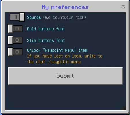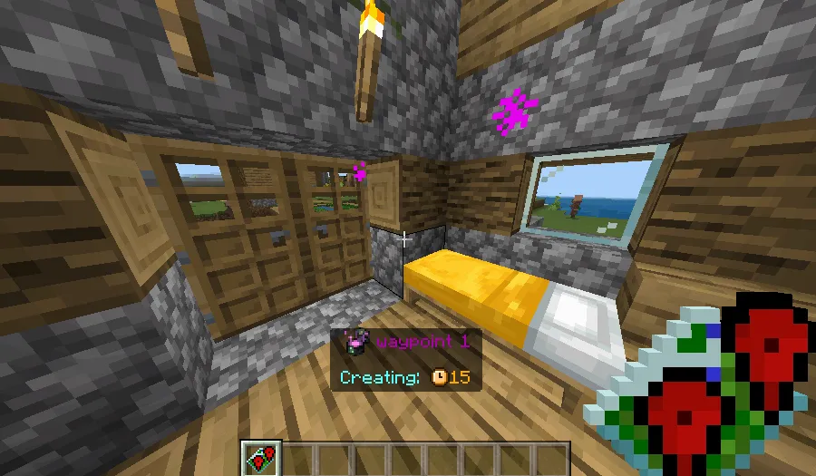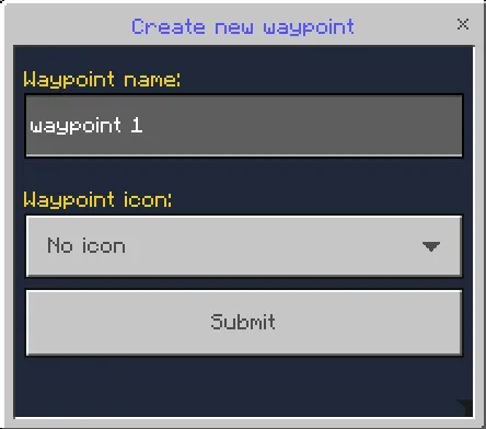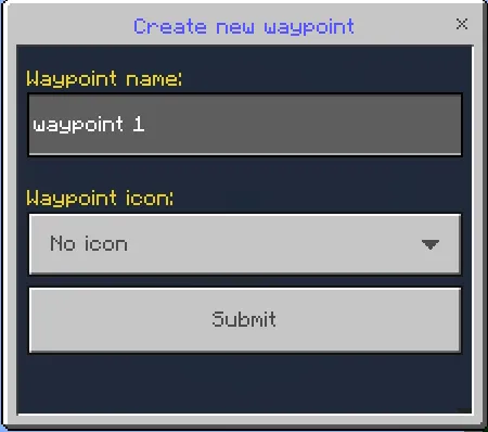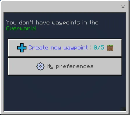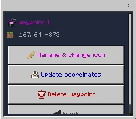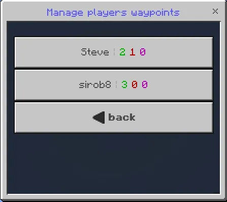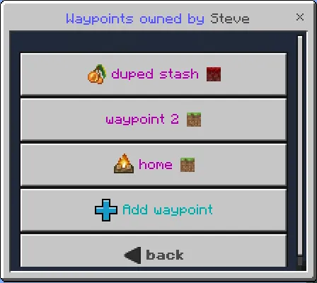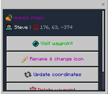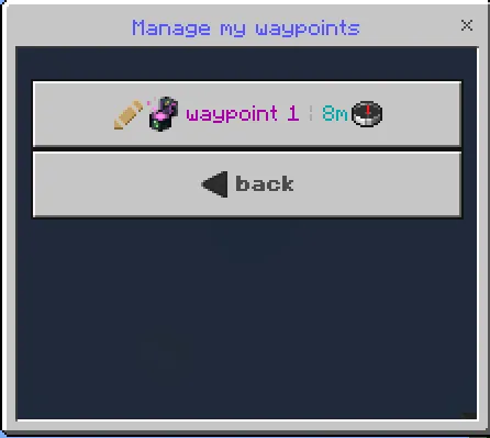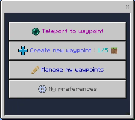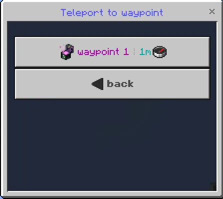 С этим дополнением каждый новый игрок, присоединившийся к миру, получит пункт «Меню путевых точек». Когда вы используете его, открывается окно пользовательского интерфейса, в котором вы можете создавать, телепортировать, удалять, переименовывать и выполнять множество других действий с путевыми точками.