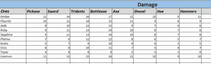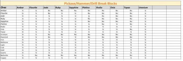 Каждый молоток, кирка и дрель этого аддона могут сломать определенное количество руд, на этом изображении я резюмирую, какие руды могут кусаться.