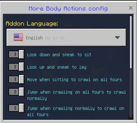 Вы когда-нибудь хотели сесть, лечь или поползти? С этим аддоном вы сможете сделать это без всяких команд, прямо в выживании! Вы также можете пролезть в 1 блок! Он также работает в мультиплеере!