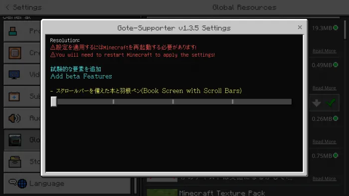 После импорта пакета ресурсов в Minecraft примените его в «Настройки -> Глобальные ресурсы».