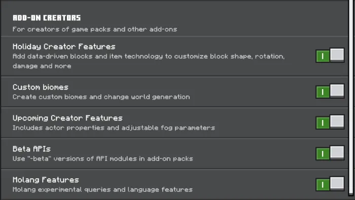 Это дополнение предназначено для работы с текущей стабильной версией (1.19.60) и ни с какой другой версией. В версии 1.19.70 появятся новые функции, которые нарушат функциональность многих функций API сценариев надстроек, которые на данный момент управляют несколькими системами. Разработчик будет работать над обновлением надстройки при каждом стабильном обновлении, чтобы создать совместимость с изменениями. Эти обновления сделают предыдущую стабильную версию непригодной для использования.
