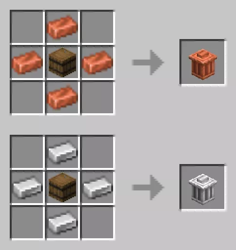 - Рецепт крафта: Скомбинируйте 1 бочку и 4 медных слитка для создания Медной мусорной корзины.
