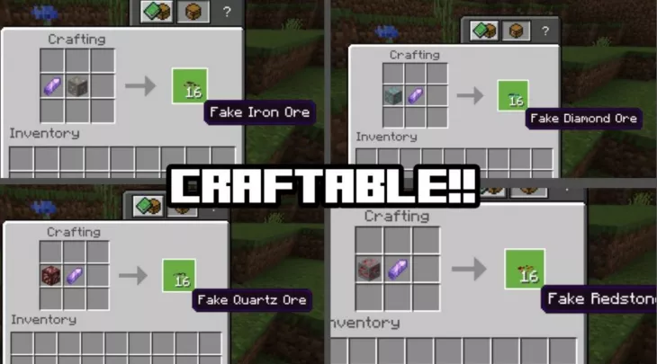 Добавьте немного веселья в свои приключения с модом Fake Ores! Эти поддельные руды неотличимы от настоящих, которые не отличит даже опытный игрок — идеально для розыгрышей друзей или оригинального декора.