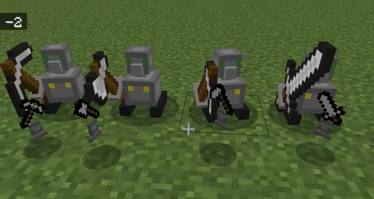 - Боевой робот обеспечивает защиту территории, автоматически атакуя любых враждебных существ в радиусе двух блоков. Это создает безопасную зону вокруг важных объектов или рабочих площадок.