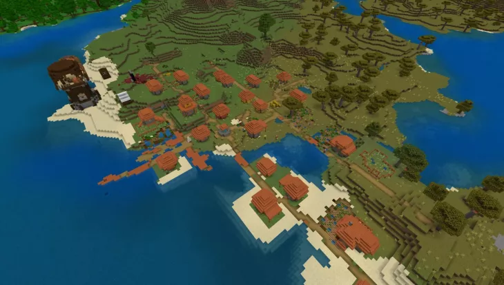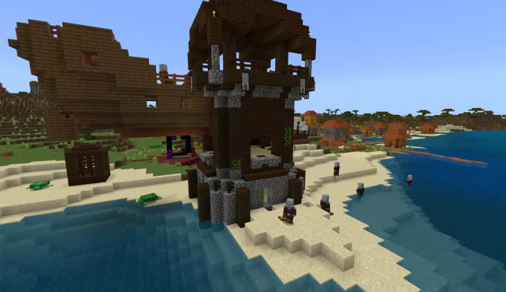 При этом башня и корабль являются не единственными преимущствами этого сида. Кроме них, вы обнаружите на стартовой локации еще много всего интересно. Совсем рядом расположен портал в Незер с неплохим лутом. Также прямо возле спавна есть и довольно крупная деревня в саване. Однако, на жителей почти сразу нападают мародеры, поэтому если вы планируете торговать, лучше сразу разобраться с этой проблемой. Также рядом со спавном есть довольно крупные джунгли, в которых можно найти храм.