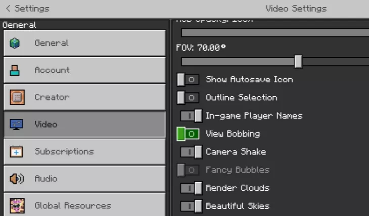 - Настройте параметры: Перейдите в "Настройки" > "Видео" и отключите переключатель "Покачивание" (View Bobbin) как показано ниже.