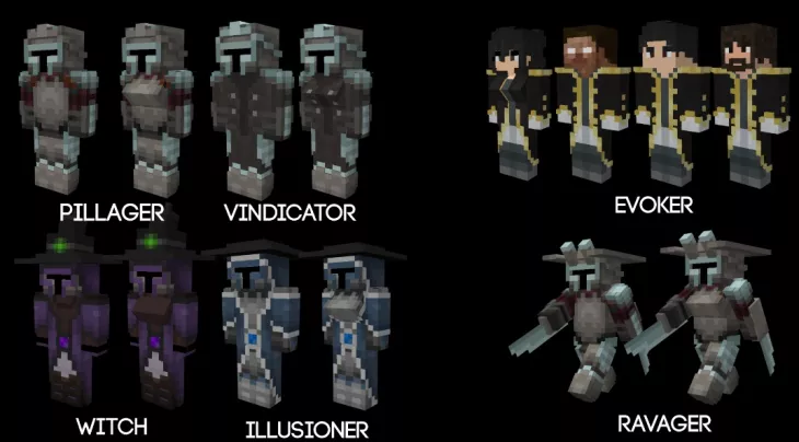 Бродячий торговец, разбойники и даже зомби переработаны, чтобы улучшить атмосферу и реалистичность игры. В отличие от традиционного внешнего вида мародеров с акцентом на плащи, этот пак одевает их в средневековые доспехи, а иллюзионистам и ведьмам добавляет мистические капюшоны. Несмотря на эти необычные решения, оригинальные цвета разбойников и мелкие детали сохранены, обеспечивая знакомый, но свежий опыт. Погрузитесь в этот обновленный текстур-пак и улучшите свой мир Minecraft с новым уровнем разнообразия и детализации.