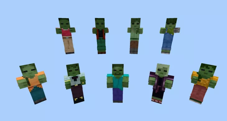 Этот текстурпак улучшает зомби в Minecraft, добавляя им случайные скины, основанные на новых стандартных скинах игроков из обновления 1.20. Больше никаких одинаковых зомби — теперь они будут выглядеть разнообразнее, а их модельки могут быть как узкими, так и широкими.