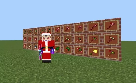 Полностью переработанное оружие с узорами леденцов и праздничными элементами. Инструменты получили рождественские цвета и festive паттерны. Комплекты брони украшены сезонными декорациями и зимними мотивами. Некоторые мобы также получили праздничные текстуры для усиления атмосферы. Дизайны включают мятные спирали, упаковки подарков и орнаментальные детали. Всё выдержано в единой цветовой палитре красного, зелёного, белого и золотого.