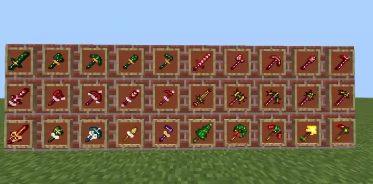 Коллекция включает широкий ассортимент переработанных предметов с креативными новогодними мотивами. Мечи и топоры стилизованы под леденцовые трости, инструменты украшены рождественскими цветами и орнаментами, а каждый элемент сохраняет узнаваемость, добавляя праздничное настроение. Текстуры варьируются от классических красно-белых полосок до зелёных дизайнов с золотыми акцентами, создавая единый праздничный стиль всего инвентаря.